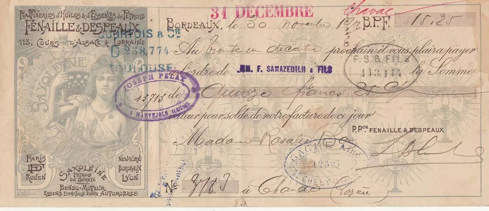 Banknote France 15.25 francs - Bank cheque receipt - Fenaille & Despeaux - 1901