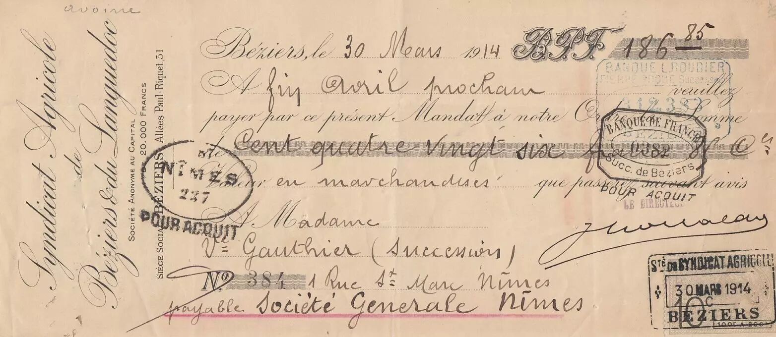 Home > World Banknotes > Checks and Traveler's Checks > France 186.85 francs - Bank cheque receipt - Syndicat agricole de Béziers et du Languedoc - 1914