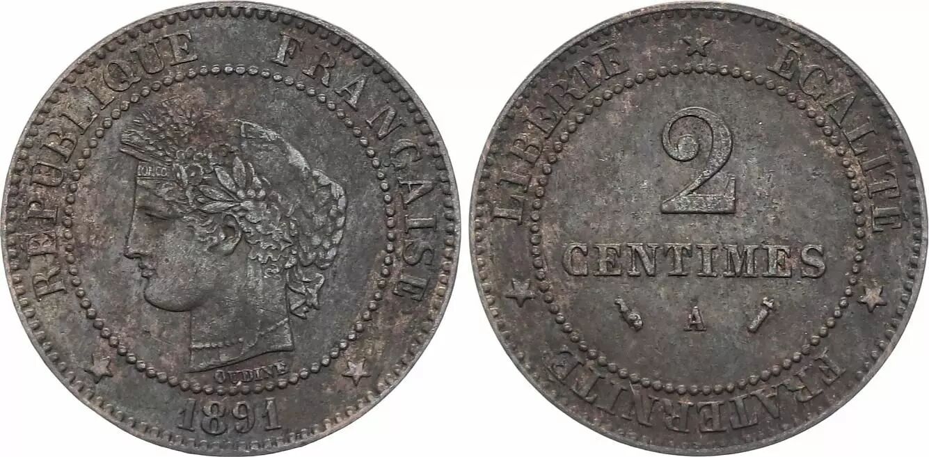 Pièce France 2 Centimes Cérès - Troisième République - 1891 A Paris