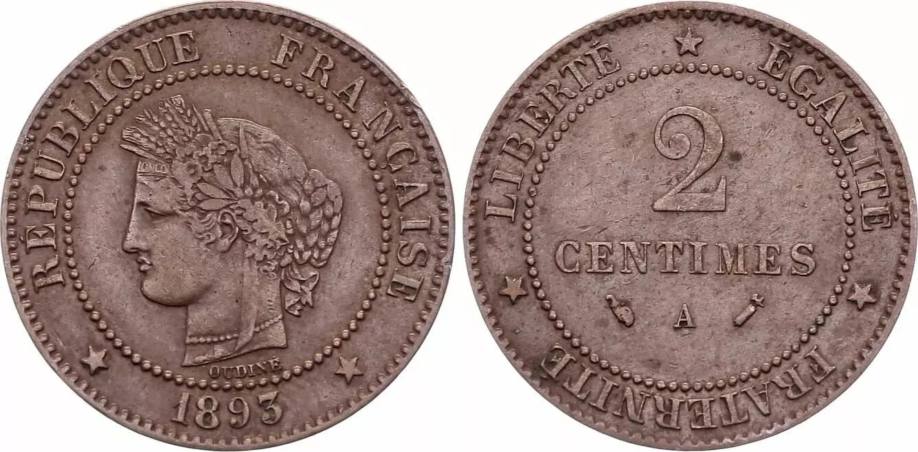 Pièce France 2 Centimes Cérès - Troisième République - 1893 A Paris