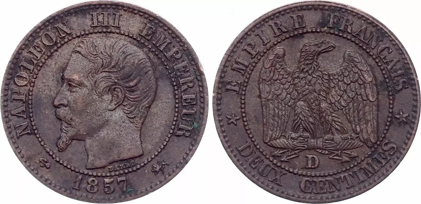 Coin France 2 Centimes Napoleon III - Nude Head - 1857 D Lyon