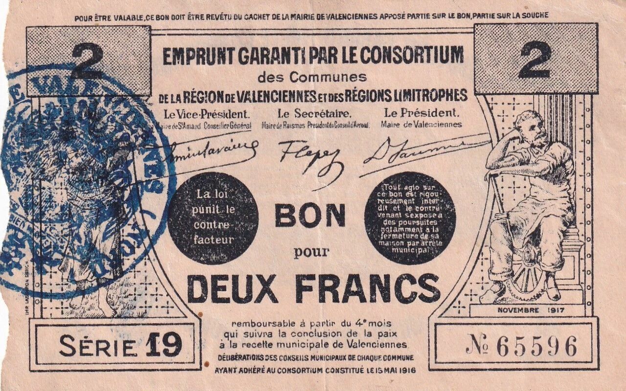 The 2 francs emergency note issued in Valenciennes in November 1917 (series 19) belongs to the local monetary issues from the end of the First World War. In the occupied northern regions, the persistent shortage of metallic currency and the difficulties in supplying official banknotes forced local authorities to extend and renew these alternative monetary systems.