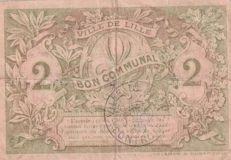 Ce billet de banque français de 2 francs a été émis par la Banque d'Émission de Lille le 15 décembre 1917. Il appartient à la série 018.