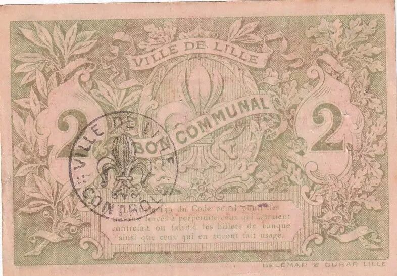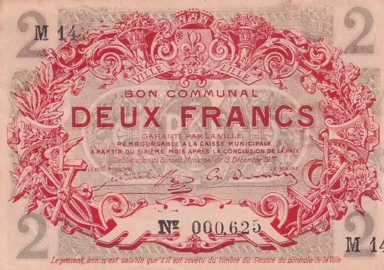 This 2 Francs banknote was issued by the Banque d'Émission de Lille on December 15, 1917. It is part of the Series M 14 and is printed in French.