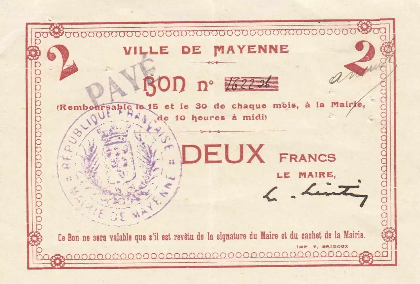 Billet France 2 Francs - Bon de la ville Mayenne - 1914-1918