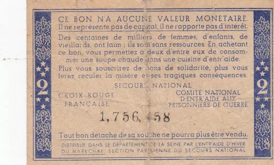 Accueil > Archivage > France 2 Francs Bon de Solidarité Pétain - Bol de Soupe 1941-1942 - 1756458