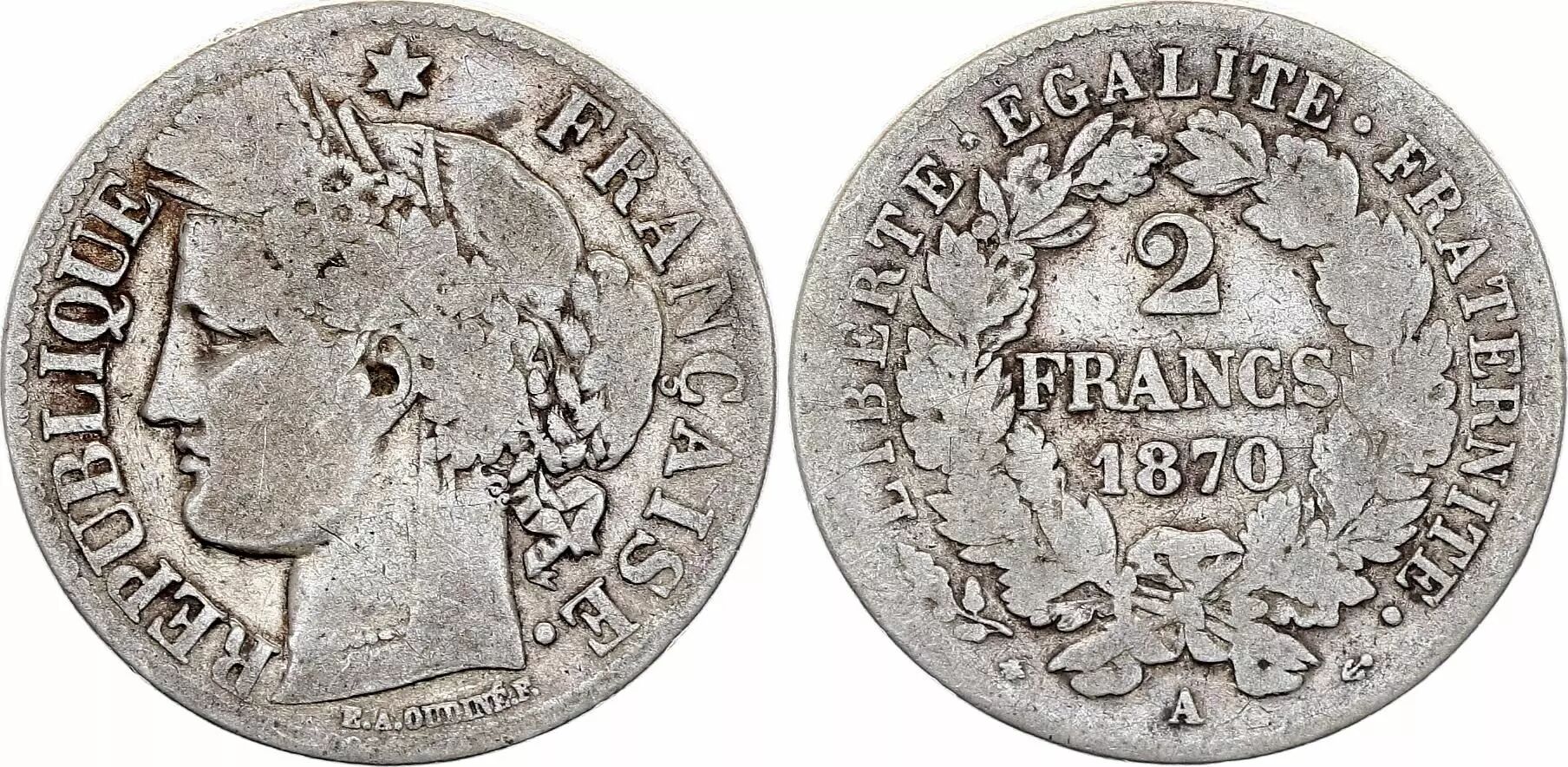 Home > > France 2 Francs Ceres - 1870 Large A Paris - Silver