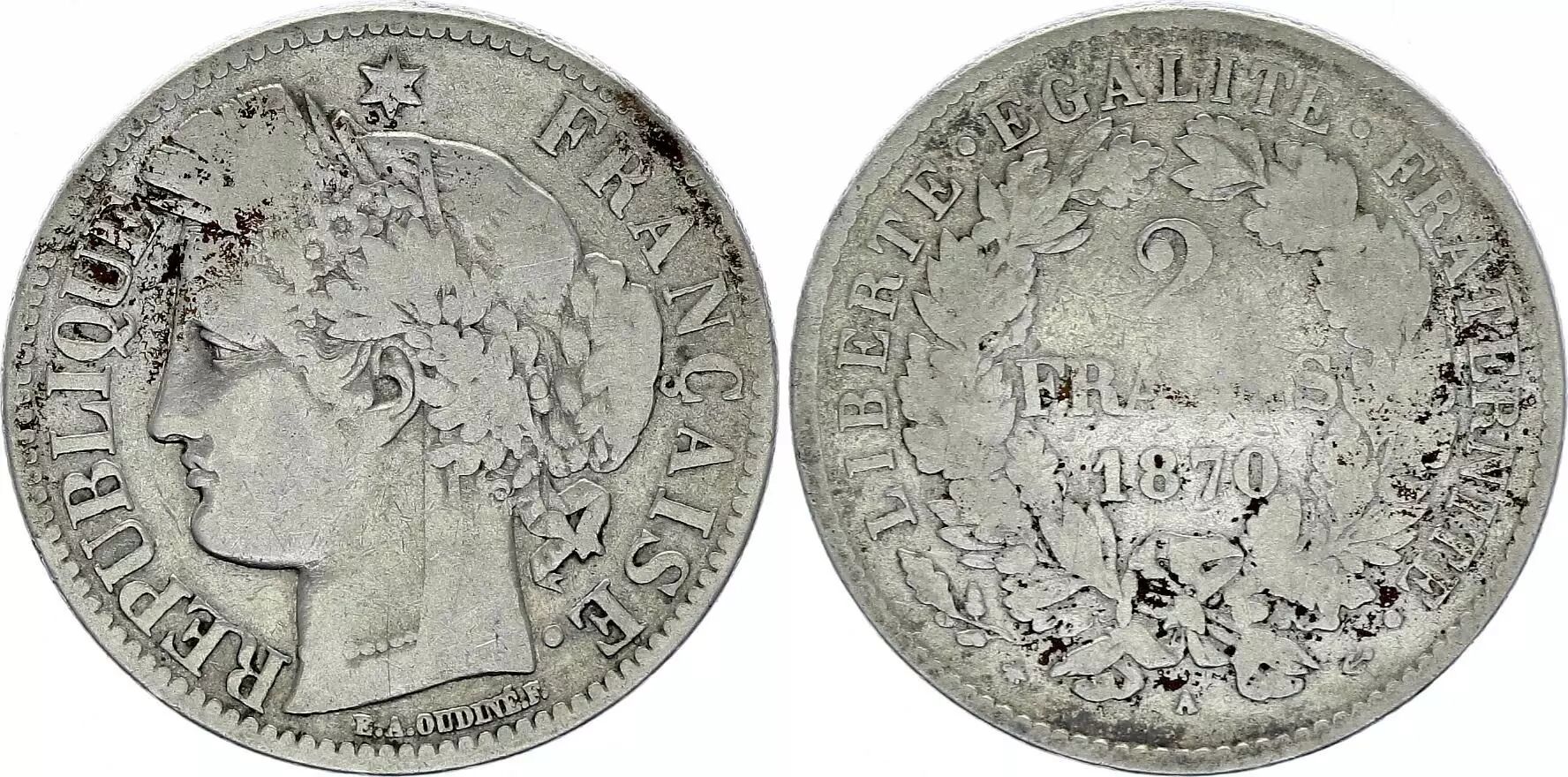 Pièce France 2 Francs Cérès - 1870 petit A Paris - pTB Argent