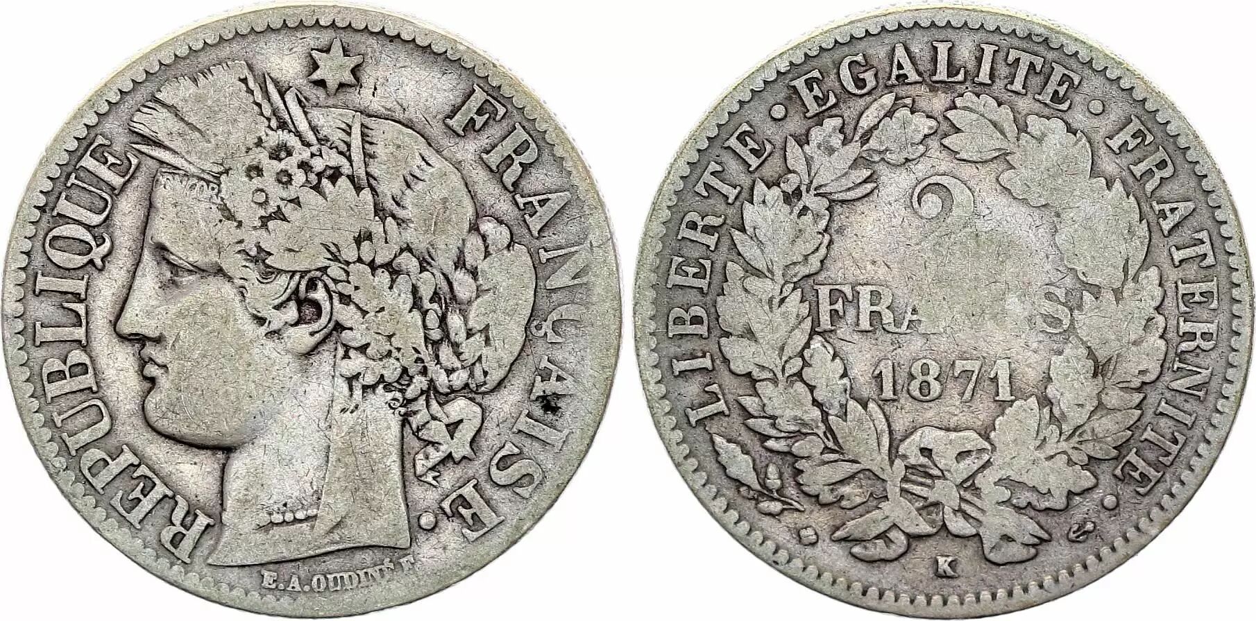 Pièce France 2 Francs Cérès - 1871 K Bordeaux - Argent