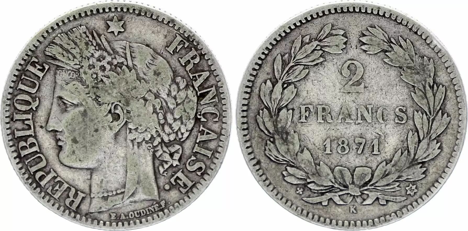 Pièce France 2 Francs Cérès 1871 K Bordeaux - sans légende - TB + - Argent