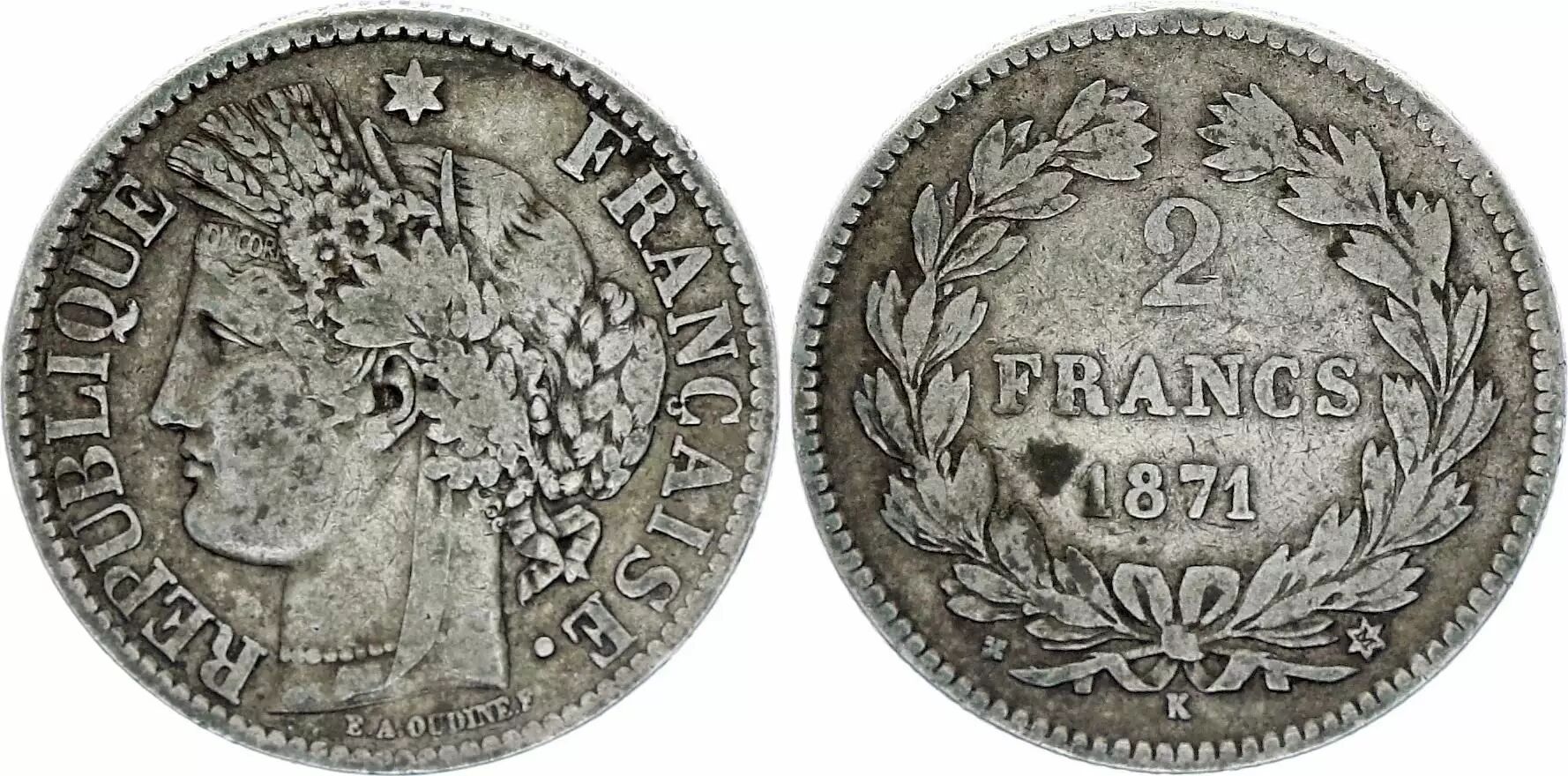 Pièce France 2 Francs Cérès 1871 K Bordeaux - sans légende TB + - Argent