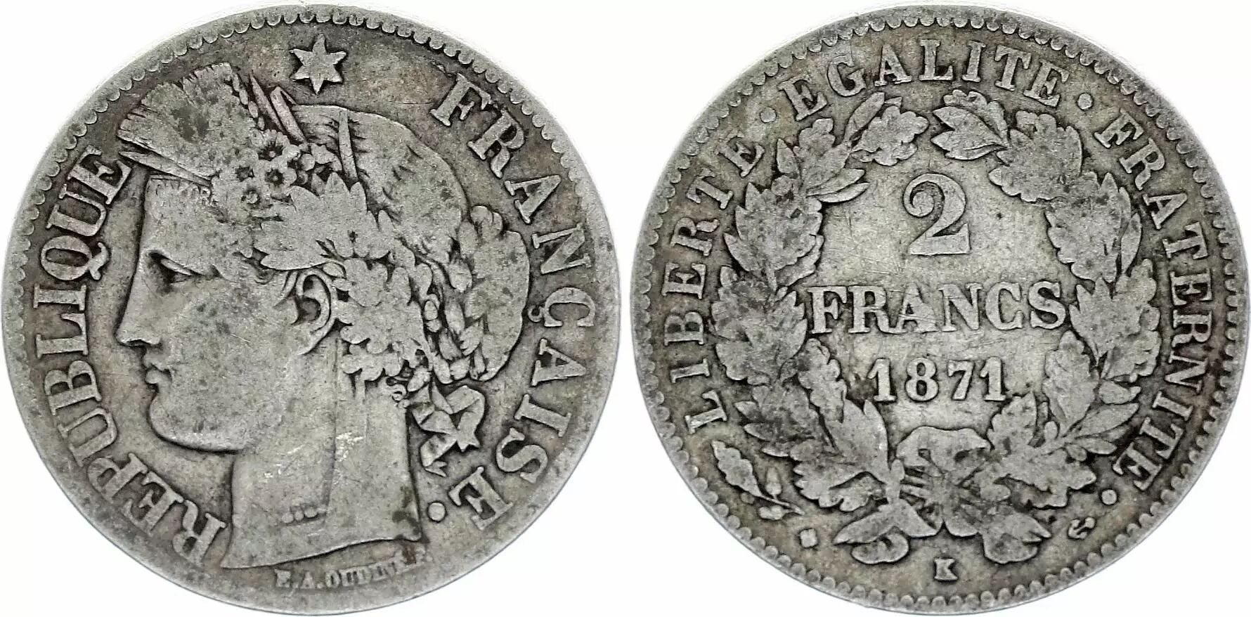Coin France 2 Francs Ceres 1871 K Bordeaux - within wreath - F to VF - Silver KM.817