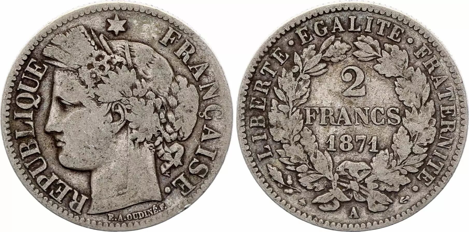 Home > > France 2 Francs Ceres - 1871 Large A Paris - Silver