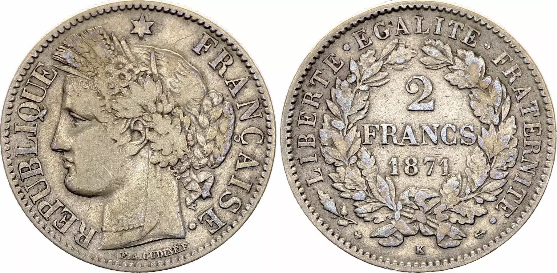 Pièce France 2 Francs Cérès - 1871 Petit K Bordeaux