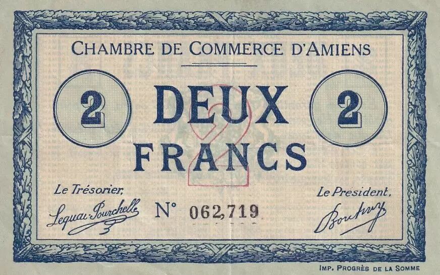 This 2 Francs banknote was issued by the Banque Duvette of the city of Amiens. Dated September 15, 1914, it bears the signatures of the delegates of the Chamber of Commerce of Amiens. The front of the banknote features an inscription in Latin characters indicating the face value of "DEUX FRANCS" as well as the mention of the "VILLE D'AMIENS" and the "BANQUE DUVETTE". The printer mentioned is "IMP. DU PROGRES".