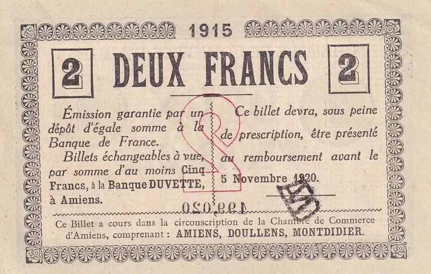This French banknote was issued by the city of Amiens, through the Banque Duvette, and dated September 15, 1915. It is a two-franc note. The identification number of this specific note is 062 719.