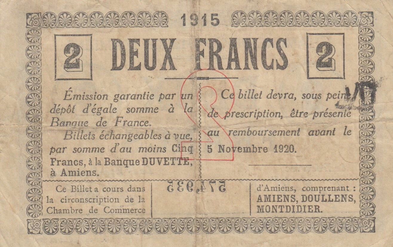 This French banknote was issued by the Amiens Chamber of Commerce in 1915. It has a face value of two francs.