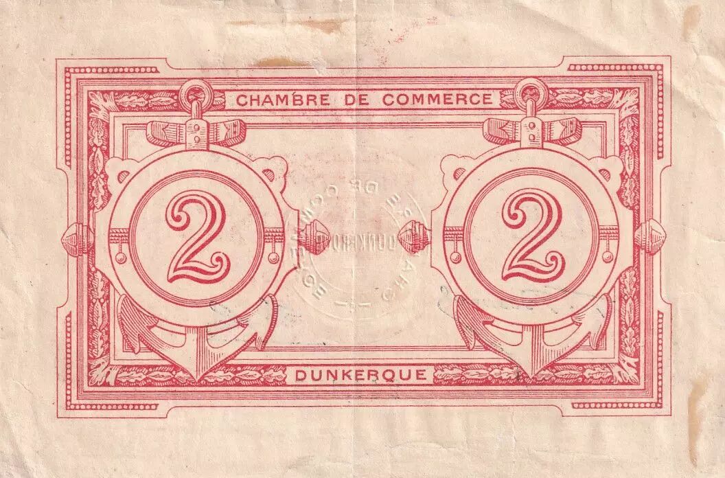 This 2 Francs banknote was issued by the Chamber of Commerce of Dunkirk. It is a type of paper money issued locally in France by institutions other than the Banque de France during periods of monetary shortage or to facilitate local commercial transactions.