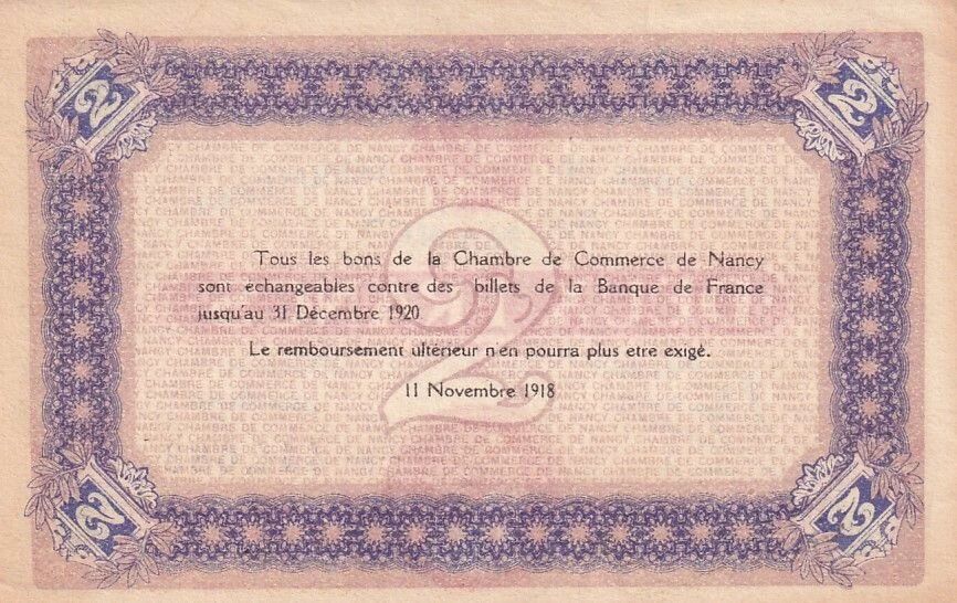 This two-franc note was issued by the Chamber of Commerce of Nancy, France. It dates from November 11, 1918, a significant date marking the end of World War I.
