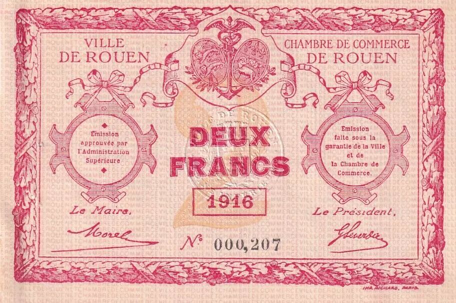 This French emergency banknote, with a face value of 2 francs, was issued in 1916 by the Rouen Chamber of Commerce. It is part of the emergency issue context, a response to the monetary shortages that occurred during the First World War.