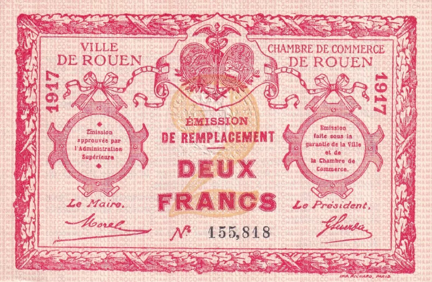 This two-franc note was issued in 1917 by the Rouen Chamber of Commerce. This is a local issue, implemented in a particular economic context, probably related to the constraints of the First World War. The note is a testimony to the economic and administrative history of the city of Rouen.