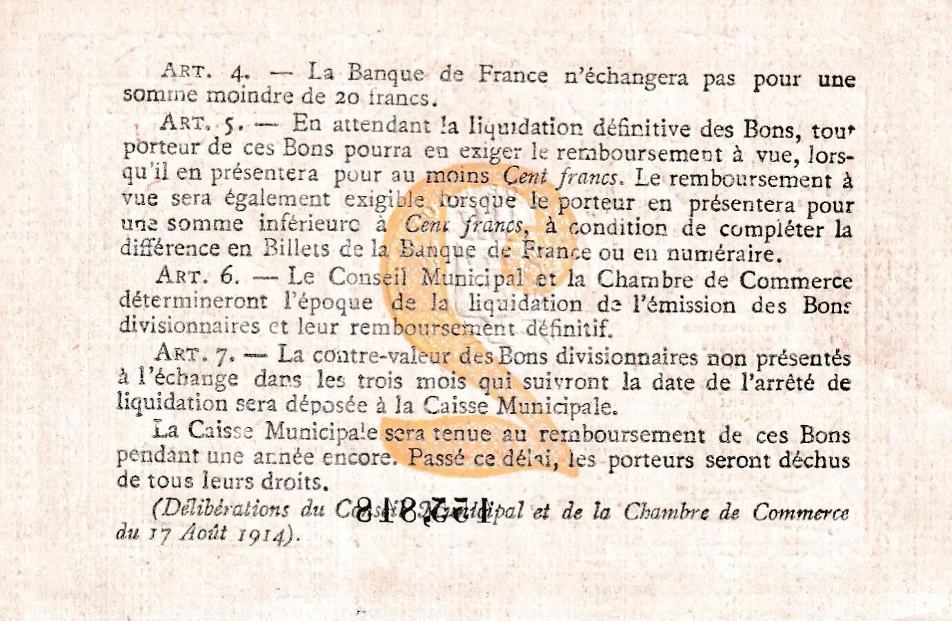 The iconography of the note presents several distinctive elements. On the front, there are medallions placed in each upper corner. These medallions display a heraldic shield, a symbol of the identity of the city of Rouen. In the center of the note, a view of the port of Rouen is represented, highlighting the importance of maritime and commercial activity for the city. The port scene depicts the river activity and the infrastructure that characterize the local economic landscape.