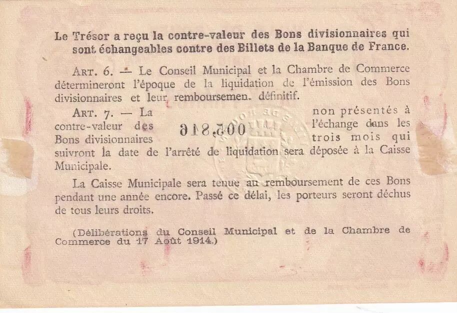 The issuance of this type of banknote by the Chambers of Commerce demonstrates their economic and administrative role during this period of crisis. Faced with difficulties in supplying currency, these local institutions were authorized to issue their own fiat money to facilitate trade at the local level.
