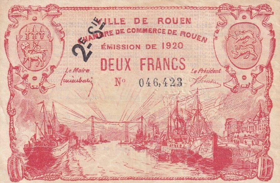 This 50 centime note, issued by the Rouen Chamber of Commerce in 1920, represents a form of local currency issued in a specific economic context. The front of the note features an ornamental frame of vegetal motifs. A central medallion displays a winged caduceus, the traditional symbol of commerce, framed by two heraldic shields. The inscription "VILLE DE ROUEN" (City of Rouen) is written above the medallion, while "CHAMBRE DE COMMERCE DE ROUEN" (Rouen Chamber of Commerce) appears below, identifying the issuer. The face value, "50 CENTIMES", is clearly indicated. A serial number, here "n°046.423", is printed on the note.