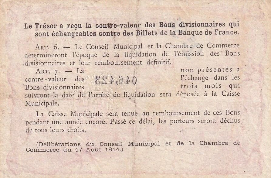 The back of the note reproduces extracts from regulatory articles relating to the issue and redemption of these fractional bonds. Article 4 stipulates that the Banque de France will not exchange the bonds for a sum less than 20 francs. Article 5 specifies the conditions for on-demand redemption of the bonds, in particular the possibility of demanding redemption for at least 100 francs, or for a smaller sum supplemented by Banque de France notes or cash. Articles 6 and 7 define the terms of liquidation of the issue and the repayment deadlines, with a limited period during which holders can assert their rights before the funds are deposited with the Caisse Municipale (Municipal Fund).