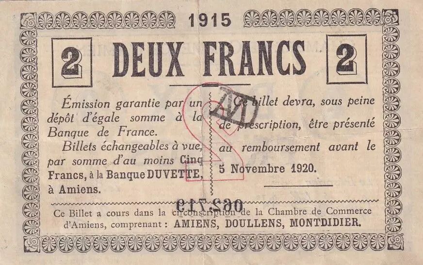 Ce billet de 2 francs a été émis par la Banque Duvette de la ville d'Amiens. Daté du 15 septembre 1914, il porte les signatures des délégués de la Chambre de Commerce d'Amiens. Le recto du billet présente une inscription en caractères latins indiquant la valeur nominale de "DEUX FRANCS" ainsi que la mention de la "VILLE D'AMIENS" et de la "BANQUE DUVETTE". L'imprimeur mentionné est "IMP. DU PROGRES".