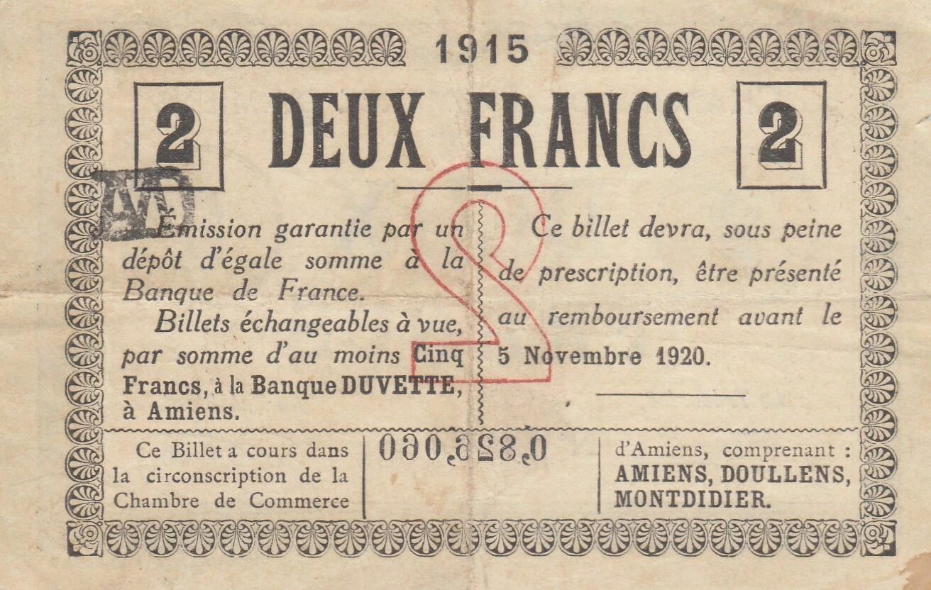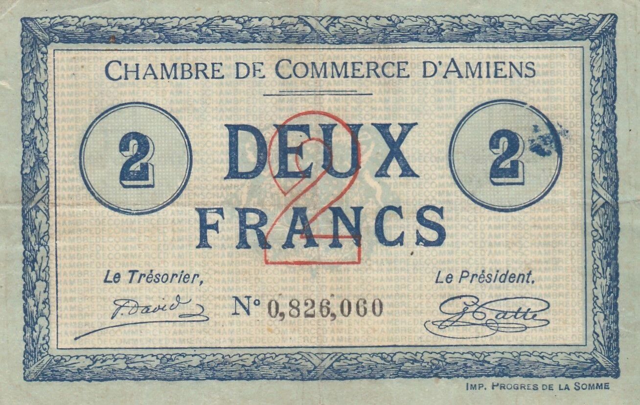 Ce billet de 2 francs a été émis par la Chambre de Commerce d'Amiens en 1915, en France. Il représente une forme de monnaie de nécessité, émise en période de pénurie de numéraire durant la Première Guerre mondiale.