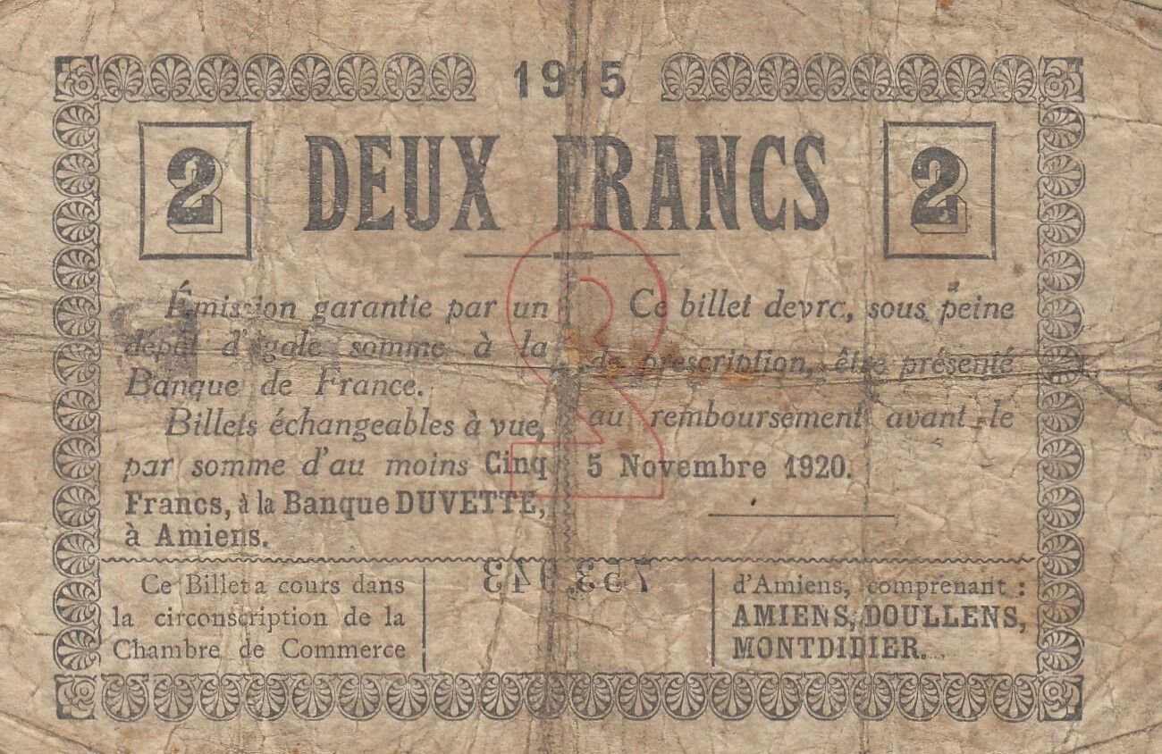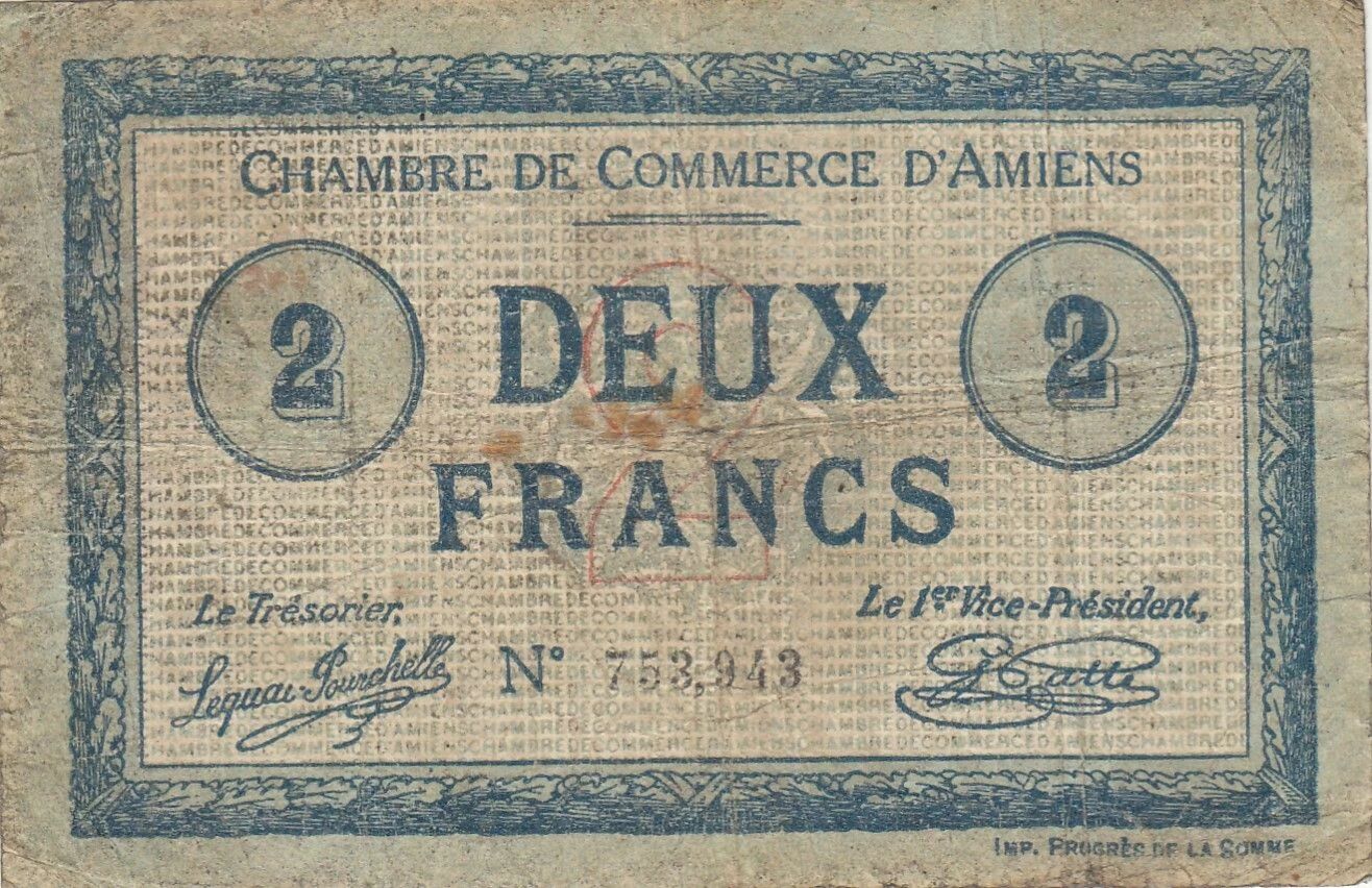 Ce billet de 2 francs a été émis par la Chambre de Commerce d'Amiens en 1915. Il témoigne d'une période où les chambres de commerce ont été autorisées à émettre de la monnaie de nécessité en raison des circonstances économiques exceptionnelles liées à la Première Guerre mondiale.