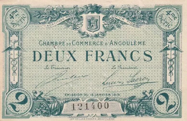 Le billet de 2 Francs émis par la Chambre de Commerce d'Angoulême en 1915 est un témoignage des émissions de nécessité durant la Première Guerre mondiale. Ce billet fait partie de la 4ème série émise par cette chambre de commerce.