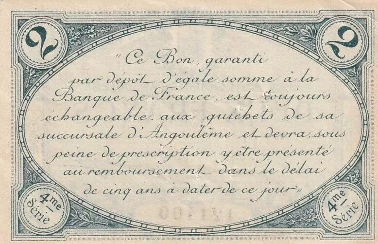 Le revers du billet porte la mention "Ce Bon garantie par Dépôt d'égal somme à la Banque de France est toujours échangeable aux guichets de sa succursale d?Angoulême et devra sous peine de prescription y être présenté au remboursement dans le délai de cinq ans à dater de ce jour." Cette inscription précise les conditions de garantie et de remboursement du billet auprès de la Banque de France. La valeur "2" est répétée de chaque côté, et la mention "4me série" est également présente.
