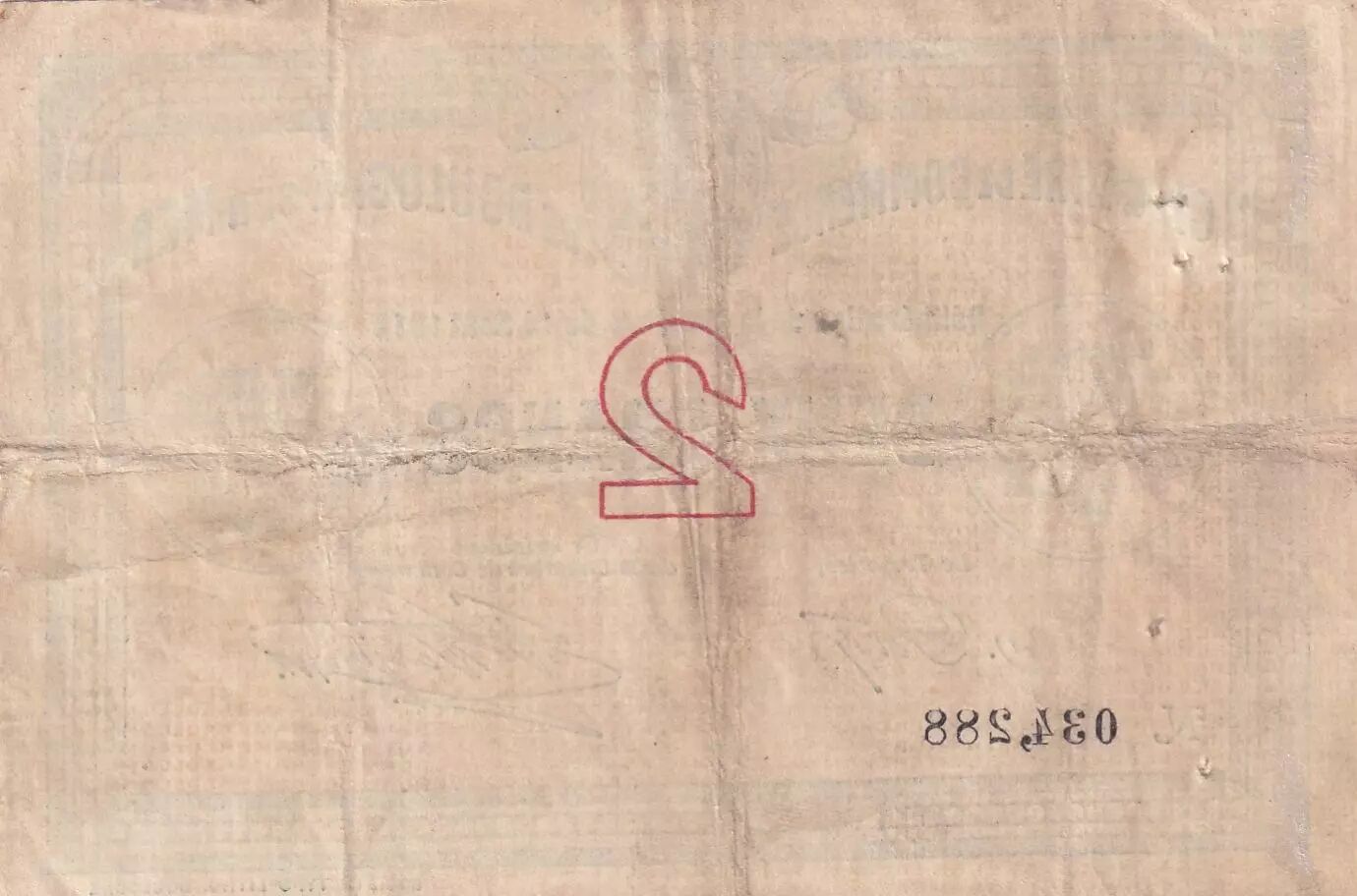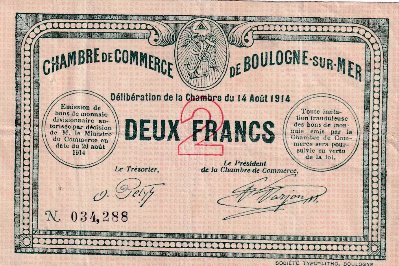 This French banknote was issued by the Chamber of Commerce of Boulogne-sur-Mer. Dated August 14, 1914, it represents a nominal value of two francs.