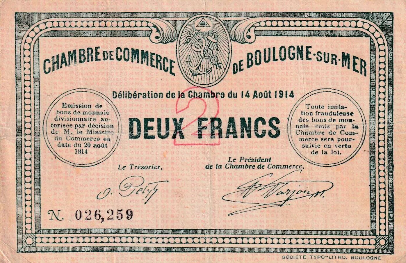 This banknote, issued by the Chamber of Commerce of Boulogne-sur-Mer, is dated August 14, 1914. It represents a nominal value of two francs. The front of the banknote features several informative inscriptions.