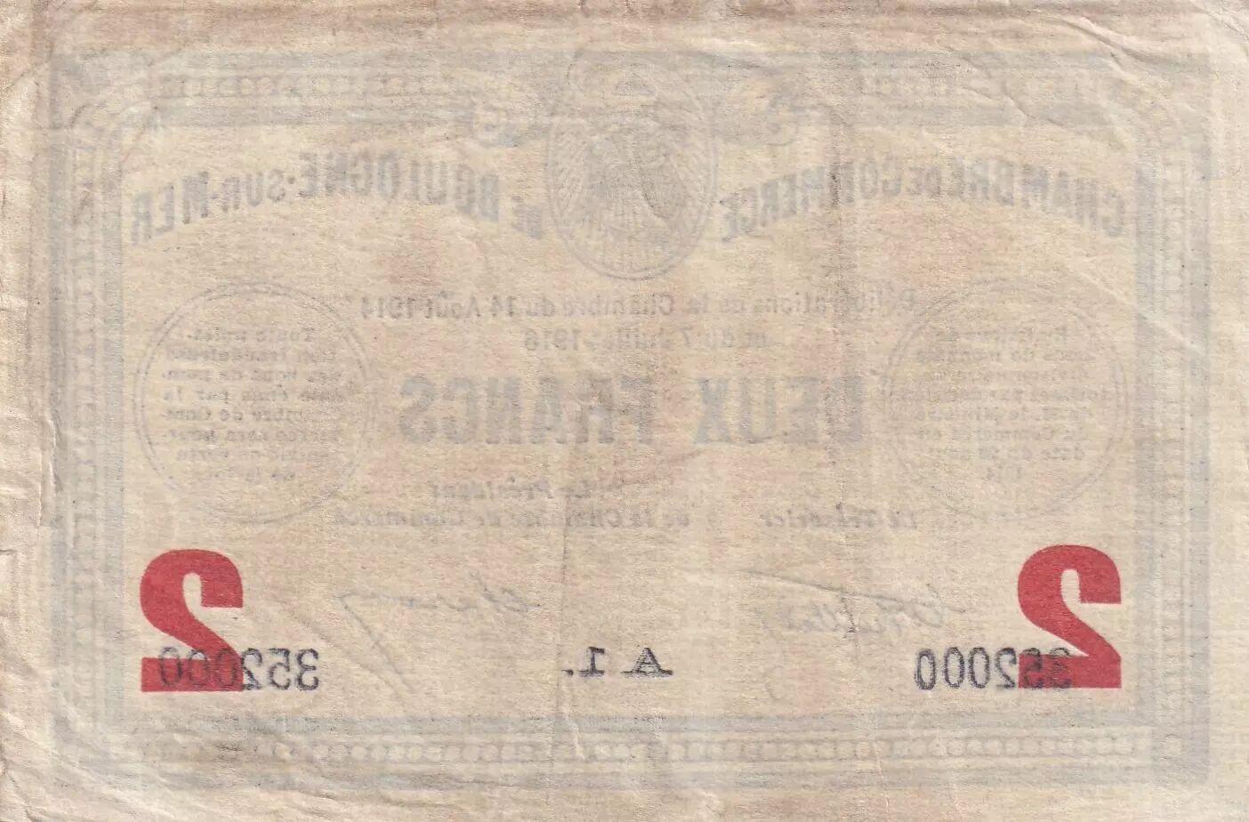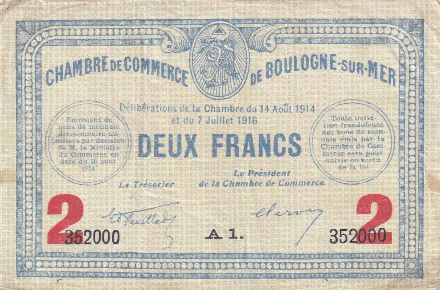 This two-franc note issued by the Chamber of Commerce of Boulogne-sur-Mer dates from August 14, 1914. It is a local emergency issue resulting from the exceptional economic and monetary circumstances of the First World War.