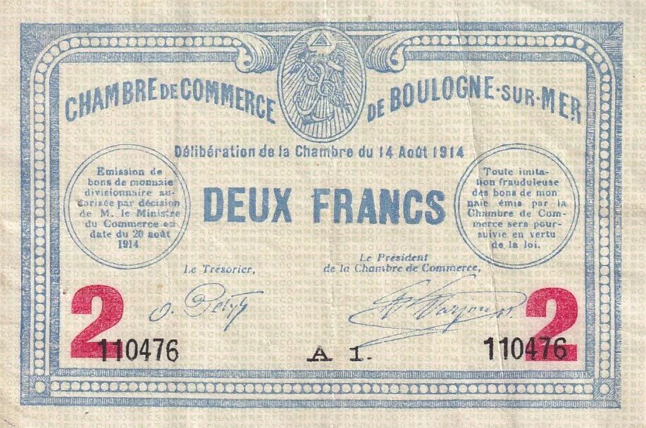 Ce billet de deux francs de la Chambre de Commerce de Boulogne-sur-Mer témoigne d'une période de crise et d'adaptation économique en France durant le conflit mondial.