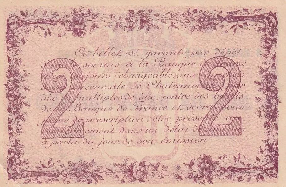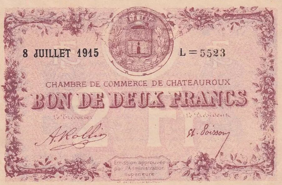Ce billet de deux francs a été émis par la Chambre de Commerce de Châteauroux en 1915. Il s'agit d'un bon, une forme de monnaie de nécessité émise en période de pénurie de numéraire.