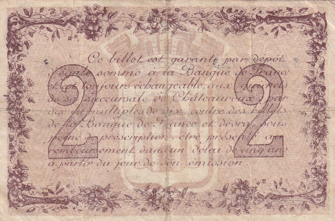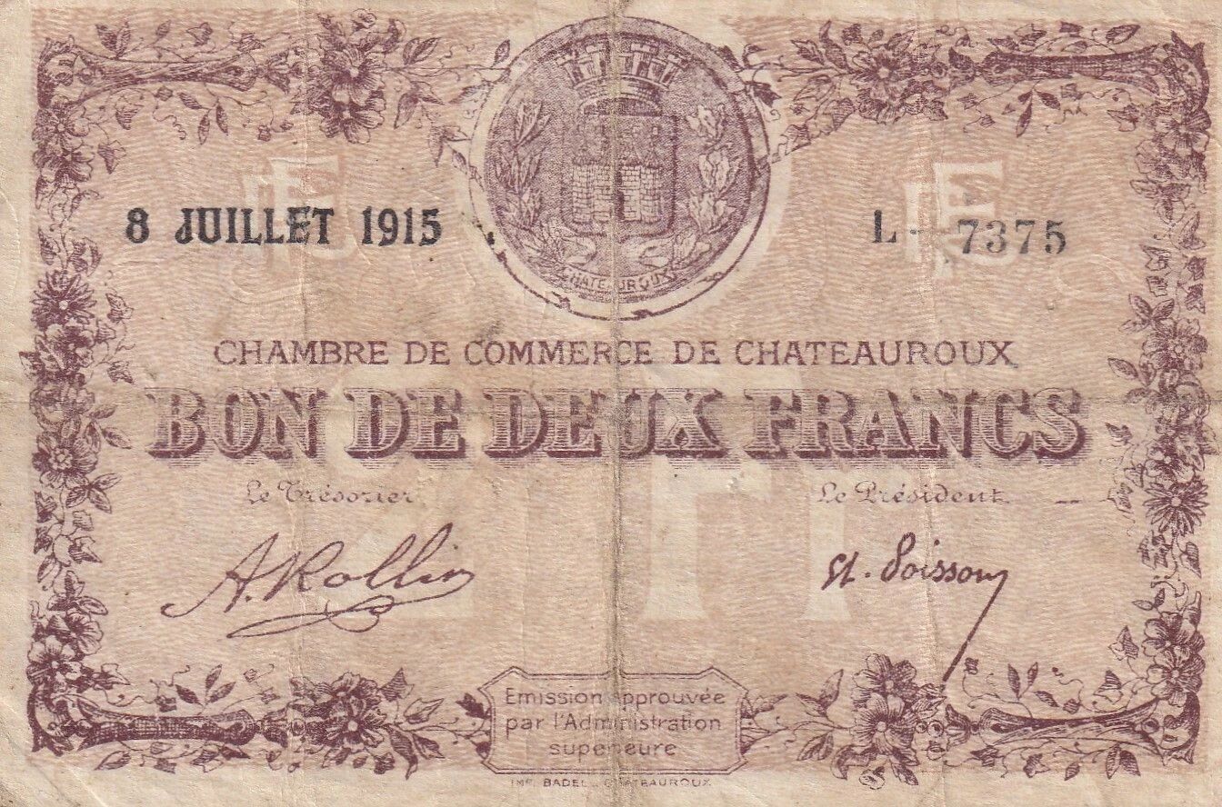 Ce billet de deux francs a été émis par la Chambre de Commerce de Châteauroux le 8 juillet 1915. Il s'agit d'un bon, émis dans un contexte économique particulier lié à la Première Guerre mondiale.