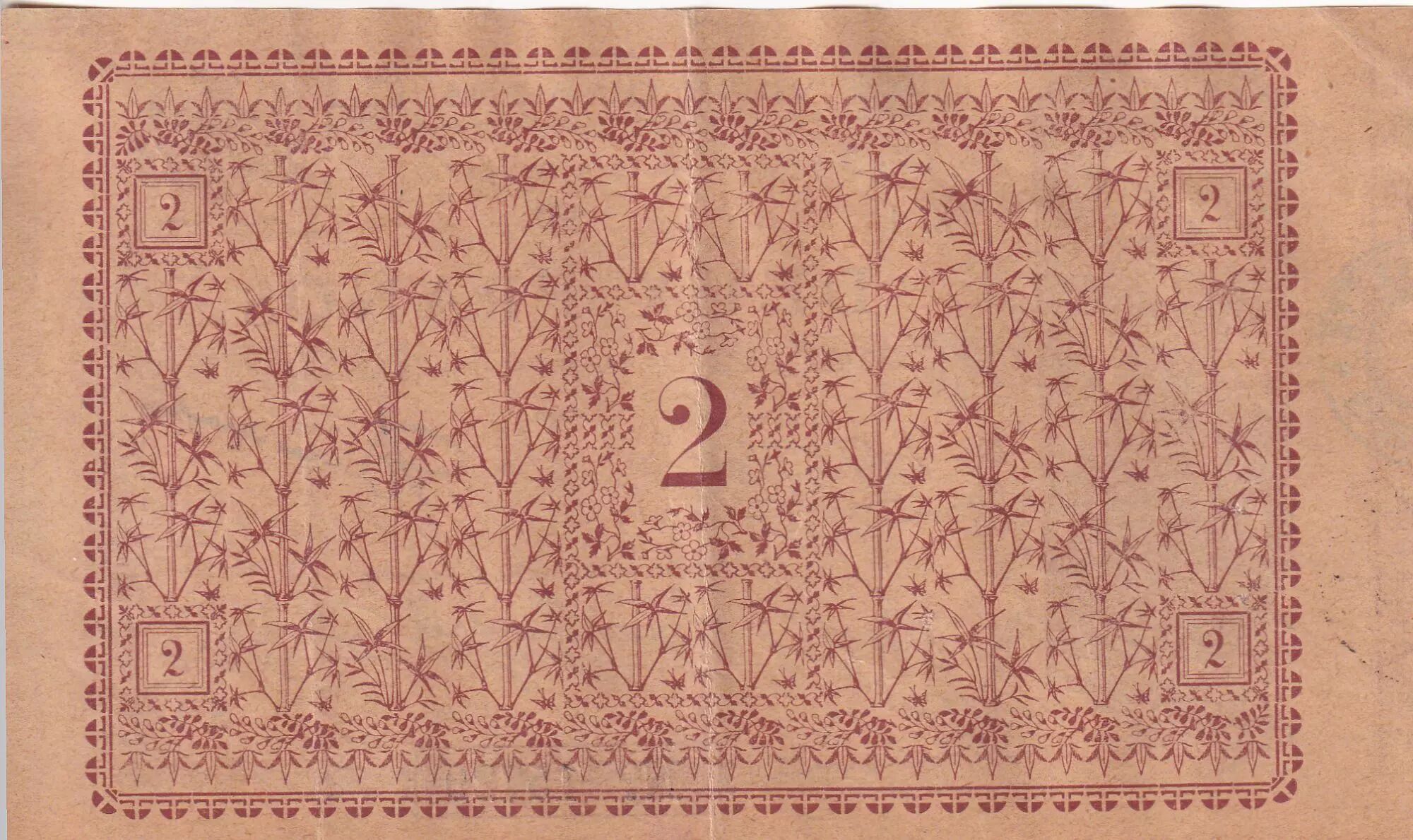 Le revers du billet est plus simple, avec la valeur nominale "2" répétée plusieurs fois, disposée de manière symétrique. On observe la présence de "2 | 2" en haut à gauche et en bas à droite, ainsi qu'un simple "2" au centre.