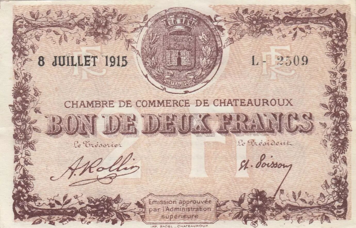 Billet France 2 Francs - Chambre de Commerce de Chateauroux - 08-07-1915 - Série L