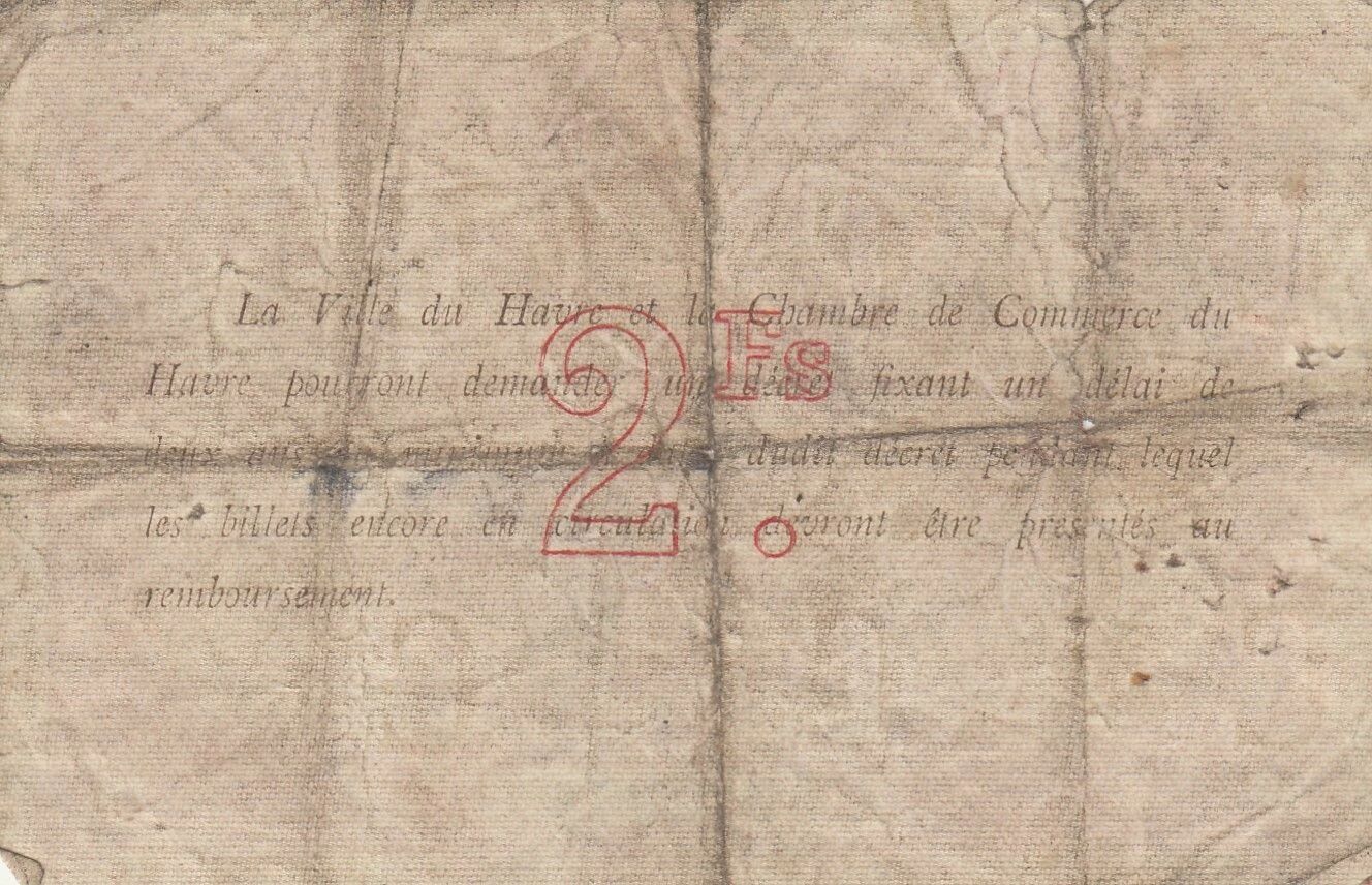 Ce billet de 2 francs a été émis par la Chambre de Commerce du Havre en 1917. Il s'agit d'une émission de nécessité, une pratique courante en période de crise économique ou de guerre, lorsque les métaux précieux nécessaires à la frappe de la monnaie se font rares.