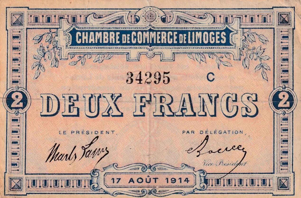 This 2-franc banknote was issued by the Limoges Chamber of Commerce on August 17, 1914. It belongs to Series C and bears the number 34295.