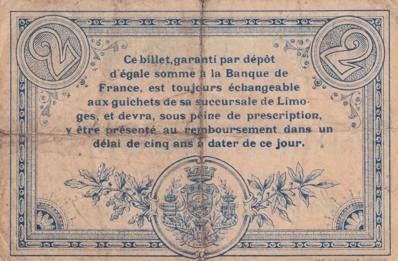 The back of the banknote contains information on the guarantee and terms of reimbursement. It stipulates that this banknote is guaranteed by a deposit of an equal sum at the Banque de France and that it is exchangeable at the Limoges branch. A period of five years from the date of issue is set for reimbursement, after which the banknote will be subject to prescription. The name of the issuing institution, "Chambre de commerce de Limoges", is also mentioned. The text is written in Latin.