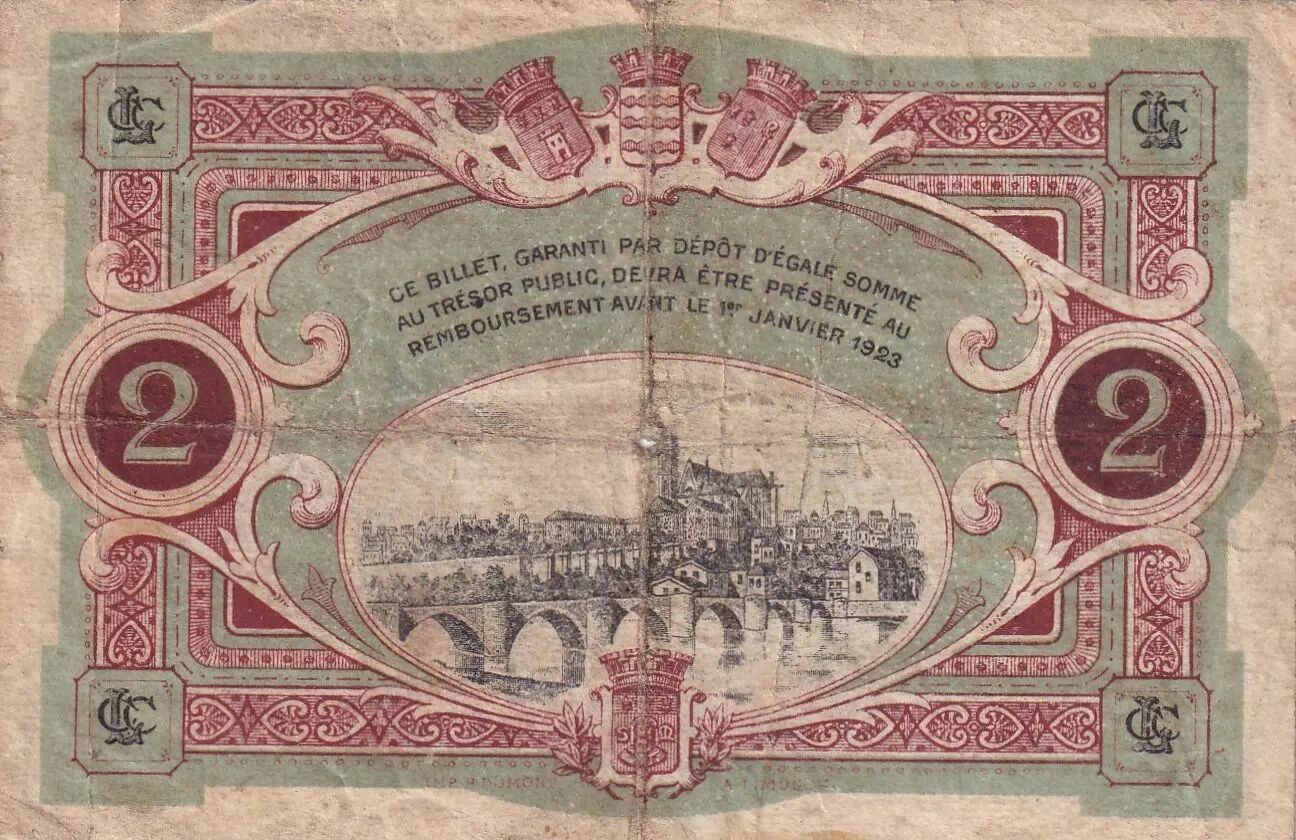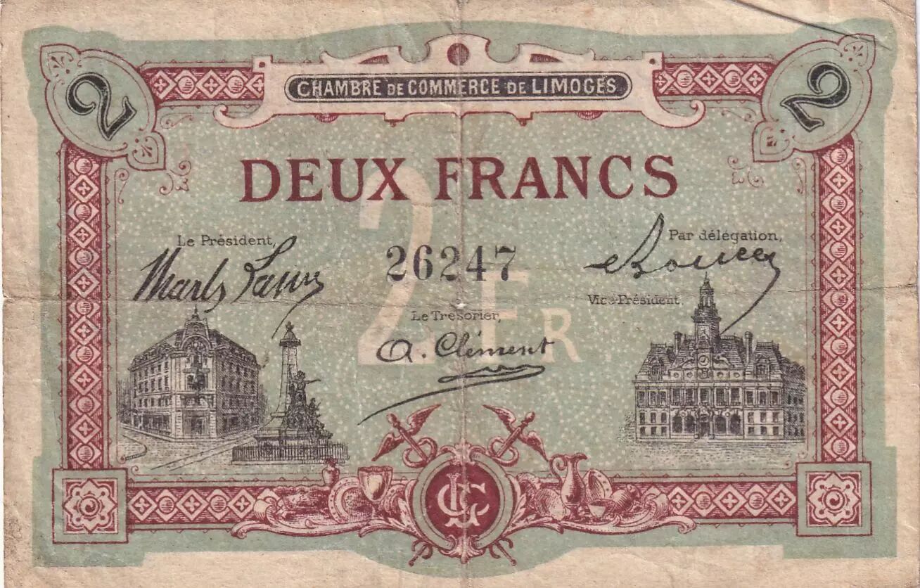 Ce billet de 2 francs a été émis par la Chambre de Commerce de Limoges en 1918. Il s'agit d'un type de monnaie de nécessité émis en France durant la Première Guerre mondiale pour pallier le manque de numéraire.