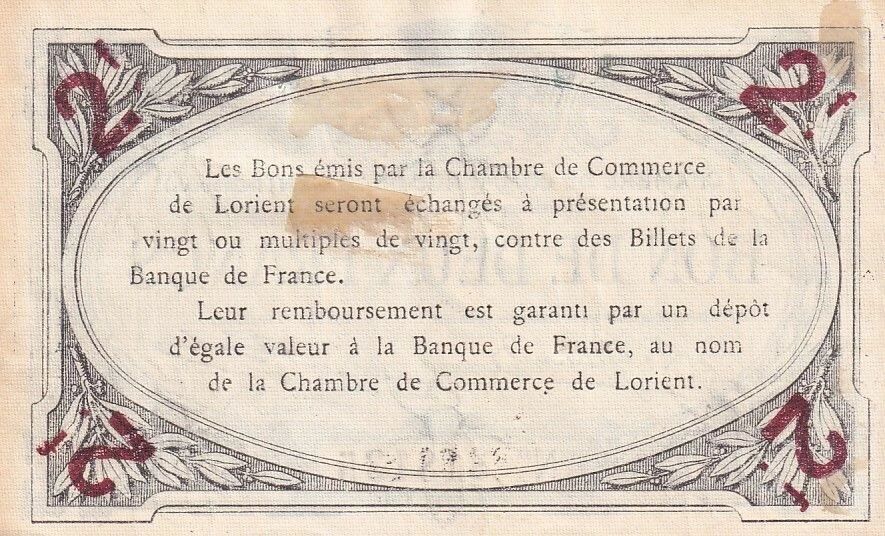 Ce billet de nécessité a été émis par la Chambre de Commerce de Lorient, en France, durant l'année 1915. Il représente une valeur faciale de deux francs. Cette émission s'inscrit dans le contexte particulier des monnaies de nécessité, mises en place pour pallier le manque de numéraire durant la Première Guerre mondiale.