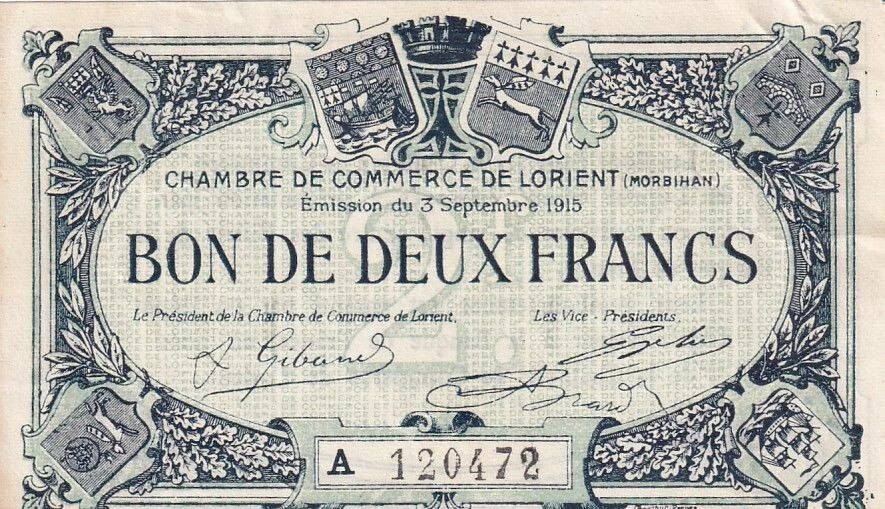Ce billet de banque est émis par la Chambre de Commerce de Lorient, en France, en date du 3 septembre 1915. Il représente une valeur nominale de 2 francs.