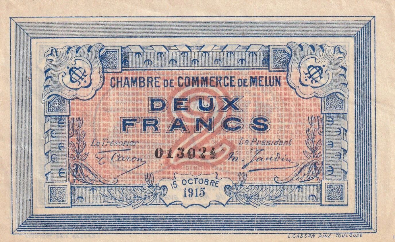 Le billet de 2 francs émis par la Chambre de Commerce de Melun en 1915 est un témoignage des émissions de nécessité durant la Première Guerre mondiale. Ce type de billet a été produit pour pallier le manque de monnaie divisionnaire en période de conflit.
