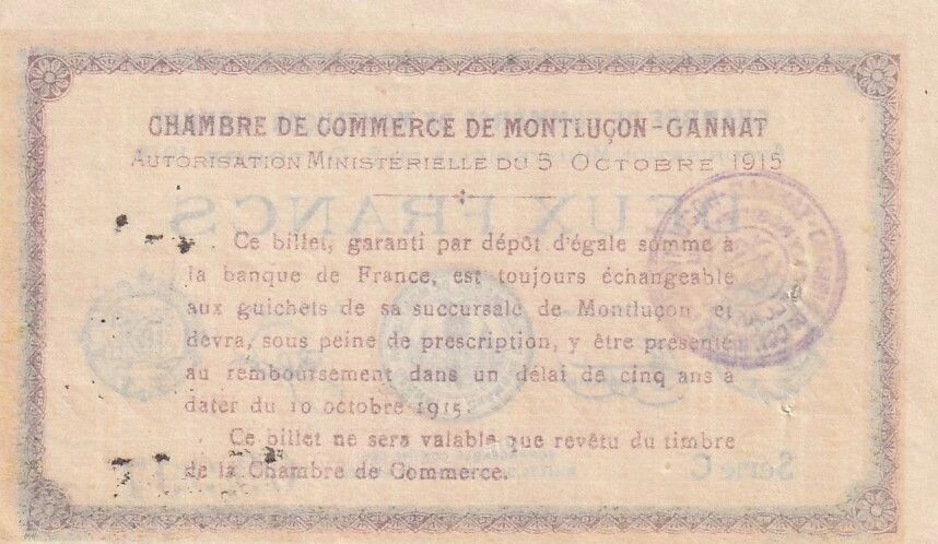This 2 Franc note was issued by the Chamber of Commerce of Montluçon-Gannat, France, with ministerial authorization dated October 5, 1915. It represents a form of emergency currency issued during a period of economic turmoil.